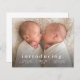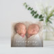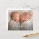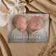 Um anúncio de nascimento de foto gêmea mínimo de orçamento com o tipo moderno e uma grande foto horizontal na frente. O verso tem 2 fotos com cabeçalho de nome grande e mensagem pessoal da família. Clique no botão editar para personalizar este design com suas fotos e detalhes.