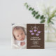 O anúncio de Nascimento da Baby Girl apresenta um adorável celular de elefantes roxos com bebês em um plano de fundo marrom. Personalize com a foto do seu bebê recém-nascido e a informação sobre o nascimento e você está pronto para ir. Itens correspondentes disponíveis em nosso compro. ©Cocoa Studio