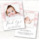Obrigado de bebê amigável em orçamento, seu anúncio de nascimento apresentando pinceladas de pincel de aquarela cor rosa macia sobrecarregadas com a foto de seu recém-nascido e "Obrigado" em um roteiro elegante e contemporâneo com uma batida cardíaca. Personalize com seu nome de cheio, data de chegada e estatísticas de nascimento em uma simples tipografia moderna. No verso, adicione uma foto adicional, um obrigado personalizado e uma mensagem de anúncio.