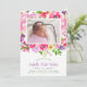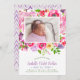 cartões com fotos de anúncio de nascimento de bebê impresso por barato. Este design brilhante tem uma borda floral de cor d'água com flores coloridas cor-de-rosa e roxas. Personalize a design com o nome do bebê, estatísticas de aniversário e nascimento e adicione suas fotos de recém-nascidos. O lado inverso tem um padrão de fevron de aquarela púrpura ou use o espaço para adicionar texto e fotos adicionais. Clique em Personalizar para escolher qualquer cor de fundo e editar as fontes e cores do texto para criar um único anúncio de nascimento de fotos do tipo para a sua menina.