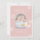 O anúncio de nascimento de uma garota bonita apresenta um fundo rosa para bebê com um globo de neve, flocos de neve e pomba branca. O verso apresenta um fundo de cinza leve com padrões brancos de neve. Personalize para suas necessidades. Você pode encontrar mais produtos correspondentes na minha loja.