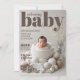 Apresente o seu novo bebê ao mundo com este elegante cartão de anúncio inspirado no cobrir da revista, com o nome do recém-nascido e as estatísticas de natalidade. A parte traseira apresenta um script elegante que lê o obrigado e uma mensagem personalizada. O design é otimizado para fotos leves de fundo, mas você pode usar qualquer imagem que quiser e personalizar as cores e a posição do texto de acordo com as suas necessidades.