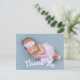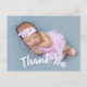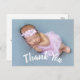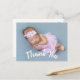 Cartões de anúncio de nascimento de bebê com agradecimento moderno com escrita curva branca na frente. Adicione facilmente sua foto e texto personalizados na frente e no verso do cartão.