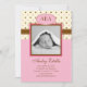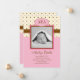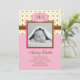 Anúncio de nascimento personalizado moderno para menina. Adicione sua própria foto e palavras. Apresenta monogramas com as iniciais do bebê e um fundo de bolinhas pontilhadas em rosa e marrom. Elegante e divertido.
