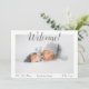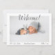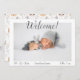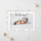 Bem-vindo! Anúncio de nascimento de bebê. Estatísticas de nascimento e pais orgulhosos listados no verso.