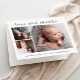 Um doce anúncio de nascimento de colagem de 3 fotos e obrigado a anotar um cartão com um simples tipo moderno e 3 fotos na frente. O interior tem um cabeçalho de nome de cheio grande e uma mensagem pessoal da família. Clique no botão editar para personalizar este design com suas fotos e detalhes.