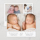 Meninos gêmeos ou raparigas, amigos do orçamento mínimo, anunciaram o nascimento da colagem de fotografias. Na frente, adicione suas fotos, nomes, datas de chegada e estatísticas de natalidade em uma tipografia simples e moderna. No verso, adicione três fotos adicionais e sua mensagem "bem-vinda".