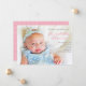 A foto 5 x 7 do seu bebê preenche a frente deste anúncio de querido. A parte traseira apresenta bolinhas brancas delicadas em um fundo de rosa claro. O texto na frente está em rosa e cinzas. Outras opções de cores disponíveis em nossa loja!