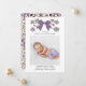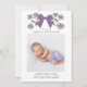Cartão de anúncio de nascimento bonito com uma foto do seu recém-nascido com ilustração de um arco roxo e flores.