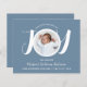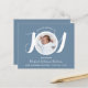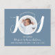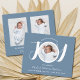 Apresente seu lindo bebê recém-nascido com este anúncio de nascimento do orçamento. A frente apresenta a palavra alegria em tipografia de script branco-na moda num fundo azul e a foto, o nome do cheio, a data de chegada e as estatísticas de natalidade do seu recém-nascido. Na parte traseira do cartão, você pode adicionar duas fotos adicionais.