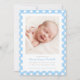 Anuncie a chegada do seu pequeno ao mundo com este lindo anúncio de nascimento de foto de solteiro. Ele apresenta um padrão de gingham azul-claro na frente e no verso do cartão, assim como muito espaço para todas as informações sobre seu recém-nascido.