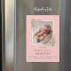 Magnetos de fotos de anúncio de nascimento de menina impressas por barato. Este design de menina doce tem uma borda floral pastel com flores roxas e cor-de-rosa e verde sobre fundo rosa. Personalize a design com o nome do bebê, estatísticas de aniversário e nascimento e fotos de recém-nascidos. Clique em Personalizar para editar as fontes e cores do texto e adicionar mais fotos para criar um único anúncio de nascimento magnético.