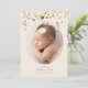 Este simples e belo anúncio de nascimento de fotos apresenta uma elegante foto vertical em forma oval na frente e flores botânicas coloridas em cascata do estilo vintage caindo do topo, sobre o topo da foto do bebê. "Apresentando" sua menina em letras altas, e detalhes de tipografia de fontes no estilo clássico do livro de histórias simples para as estatísticas de nome e nascimento do bebê, incluindo data, peso e comprimento. O verso oferece uma oportunidade de enviar uma mensagem personalizada personalizada de família sincera e inclui outra foto, desta vez horizontal, para um total de duas fotos incluídas neste modelo de anúncio de nascimento personalizável. Tudo feito em lindos tons pastéis de rosa, coral, pêssego, verde, azul, amarelo e vermelho.