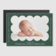 Íman simples e moderno de anúncio de nascimento com a fotografia do seu bebê aninhada dentro de um quadro verde de floresta com escala. Personalize o ímã de anúncio de nascimento adicionando o nome do seu bebê e informações adicionais em letras brancas.