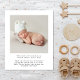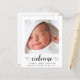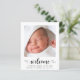 Um simples anúncio de nascimento favorável ao orçamento. A frente apresenta a foto, o nome, a data de chegada e as estatísticas de natalidade do seu recém-nascido, e "bem-vindo" em um roteiro de na moda com batidas cardíacas. Ao contrário, adicione uma foto adicional, nomes de pais e irmãos e um obrigado personalizado que você ou outra mensagem.