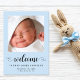 Um simples e fofo anúncio de nascimento de um bebê azul pastel. A frente apresenta sua foto, nome, data de chegada e estatísticas de natalidade, e "bem-vindo" escrito em um roteiro de na moda com batidas cardíacas. No verso da placa, adicione uma foto adicional, nomes de pais e irmãos e um obrigado para você ou outra mensagem.