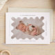 Cartão de anúncio de nascimento branco e doce, com foto desenhada à mão de uma linha ondulada em branco.