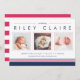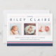 Anuncie a chegada de sua doce menina com nossos anúncios de nascimento do estilo de colagem moderno e pré-disquete, apresentando três de suas fotos favoritas de recém-nascidos em formato quadrado, acentuadas com as teclas modernas e elementos listrados em azul-marinho clássico e rosa-vibrante fúcsia. Personalize com o nome do seu bebê, as estatísticas de natalidade e a mensagem da família usando os campos fornecidos.