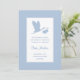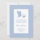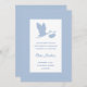 Anúncio de nascimento simples, mas atraente, azul e branco com uma silhueta de uma cegonha voadora.