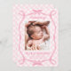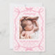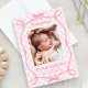 Este doce anúncio de nascimento apresenta uma foto vertical com uma faixa de fita desenhada à mão rosa e um padrão rosa de gingham. Você pode adicionar facilmente outra foto e texto no verso, se necessário.
