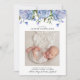 Cartão de anúncio de nascimento russo com uma foto vertical do seu recém-nascido com ilustração aquática de cor azul clara com verde.