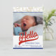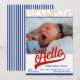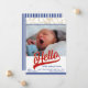 Adorável anúncio de nascimento no tema do beisebol com um grande "Olá" para o dia de abertura e bolas de beisebol em padrão de ouro sobre fotos e listras de beisebol da vintage azul atrás.