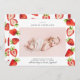 Cartão de anúncio de nascimento bonito com uma foto do seu recém-nascido com ilustração aquosa de morangos.