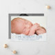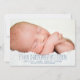 Completamente moderno e simplesmente elegante, este design apresenta duas grandes fotos do seu bebê - uma na frente e outra atrás. A frente também guarda informações importantes sobre natalidade e nomes de pais de bebês. Fontes estiladas contemporâneas adicionam à aparência moderna.