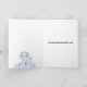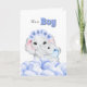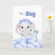 Uma bela ilustração de um lindo elefante-mãe de desenho animado com orelhas cor-de-rosa agarrando seu filhote ao peito. Ela tem lindas flores de anêmona azul na cabeça e está sentada em um buquê azul de folhas de pétala. O pequeno bebê tem orelhas azuis e está abraçando o peito das mães. As palavras, é um menino, aparecem em um fundo branco e o dentro tem um modelo para sua mensagem personalizada.