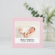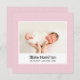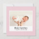 Cartão quadrado de anúncio de nascimento de menina personalizado com uma foto, seu nome, estatísticas de nascimento e uma mensagem personalizada no verso. Design cor-de-rosa com um padrão moderno de verificação.
