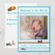 Design frente apresenta um fundo azul com pontos polka brancos como fundo para a foto que você fornece. O título personalizável e o nome do recém-nascido são exibidos em caracteres azuis contra uma faixa branca. A imagem de um comboio de brinquedos nas vias aparece acima do nome. Imagem de um carro de corrida de brinquedos é mostrada abaixo. O reverso apresenta seu texto personalizável de natalidade em azul, contra um fundo branco. As imagens dos brinquedos são apresentadas abaixo do texto.