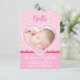 Coração cor-de-rosa com um cadáver branco e corações no fundo. Personalize e personalize este anúncio de nascimento para o seu recém-nascido com a sua fotografia e texto.