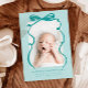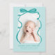 Cartão de anúncio de nascimento branco e doce, com fotografia desenhada à mão de uma linha verde com um arco no topo.