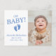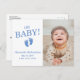 Bem-vindos ao seu recém-nascido ao mundo com estes lindos cartões de posto de anúncio de nascimento de um bebê apresentando a sua fotografia com as palavras "Oh Baby!" e os pés de bebê com o nome do seu bebê e os detalhes de nascimento impressos em azul. Personalize-o com as modelos fornecidas para sua foto, nome e natalidade na frente. Modelos para a sua mensagem e endereço de retorno estão no verso.
