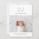 Este na moda e elegante cartão de nascimento de fotografia de dois lados apresenta quatro (4) fotos (frente e verso) do seu bebê recém-nascido, texto personalizado que pode ser personalizado, faixa de folhagem azul-bebê e monograma. Personalize este modelo, adicionando o nome do seu bebê recém-nascido, o registro de nascimento e os nomes dos pais.