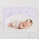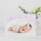 Cartão simples de anúncio de nascimento com um quadro de arco branco com a fotografia do seu recém-nascido. O texto diz "obrigado você" na letra do script com coração.