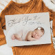 Cartão simples de anúncio de nascimento com um quadro de arco branco com a fotografia do seu recém-nascido. O texto diz "obrigado você" na letra do script com coração.