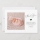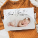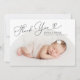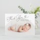 Cartão simples de anúncio de nascimento com um quadro de arco branco com a fotografia do seu recém-nascido. O texto diz "obrigado você" na letra do script com coração.