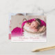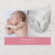 Um cartão de nascimento de uma menina fotográfica moderna para apresentar sua linda filha bebê recém-nascida. A frente inclui uma foto de bebê, com um nome de script rosa desenhado à mão e estatísticas de natalidade. O reverso tem mais duas fotos de bebês e inclui uma mensagem de script branco e o(s) nome(s) da família ou dos pais definidos em um plano de fundo rosa suave. Projetado por Thisnotme©