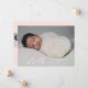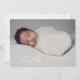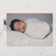 Anúncio de nascimento com um script moderno Hello sobrepondo-se à foto. A parte traseira permite três fotos extras e uma mensagem com uma cor de fundo editável.