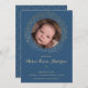 Este anúncio de tenda e belo nascimento de fotos apresenta uma ilustração dourada da coroa floral com a palavra "abençoado" rodeando uma fotografia. A foto e o texto (palavras e cor) podem ser personalizados para anunciar a chegada do seu novo bebê. A cor de fundo no verso (mostrada em azul marinho) também pode ser alterada para seu gosto.