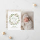 Cartões de nascimento de bebê com impressão personalizada de barato com uma coroa floral botânica de cor aquosa em tons bonito de verde com flores brancas. Personalize a design com o nome do bebê, estatísticas de aniversário e nascimento e adicione suas fotos de recém-nascidos. Use as ferramentas de design para escolher qualquer cor de fundo, adicionar mais fotos, alterar fontes de texto e cores para criar um único anúncio de um tipo de nascimento de fotos.