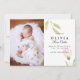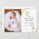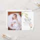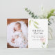 Este na moda e elegante cartão de nascimento de foto de dois lados apresenta quatro (4) fotos (frente e verso) da sua bebê recém-nascida, texto personalizado que pode ser personalizado e flor de cor-de-água rosa esmaecida e verde. Personalize este produto adicionando o nome do seu bebê recém-nascido, imagens, registro de nascimento e os nomes dos pais.