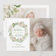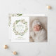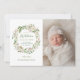 Cartões de nascimento de bebê com impressão personalizada de barato com uma coroa floral botânica de cor aquosa em tons bonito de verde com flores brancas. Personalize a design com o nome do bebê, estatísticas de aniversário e nascimento e adicione suas fotos de recém-nascidos. Use as ferramentas de design para escolher qualquer cor de fundo, adicionar mais fotos, alterar fontes de texto e cores para criar um único anúncio de um tipo de nascimento de fotos.