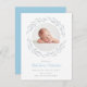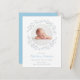 Garland deixa o cartão de nascimento do bebê fotográfico para apresentar seu lindo bebê recém-nascido. A frente inclui uma foto circular de bebê enquadrada por uma delicada terra azul e prateada das folhas. Personalize o nome do seu bebê em um guião azul delicado e estatísticas de natalidade em prata. O inverso tem um delicado fundo azul. Projetado por Thisnotme©