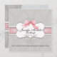 Numa paleta sutil e sofisticada de cinza suave de pombo e rosa pastel, este Anúncio de Nascimento apresenta elegantes redemoinhos e floreios em estilo de caligrafia copperplate francesa ao fundo, floreios de texto, uma moldura em forma de suporte e um lindo laço de fita rosa pintado à mão, com uma borda de renda de cetim estilo franzido francês. Tudo feito a partir de obra de arte original em aquarela pintada à mão por Audrey Jeanne Roberts. O resultado é um conjunto para bebê moderno e contemporâneo de beleza exquisita. No verso, há o mesmo padrão de damasco e um suporte que revela um espaço para a foto do seu bebê. Você pode facilmente adicionar sua própria imagem ou alterar as mensagens.