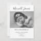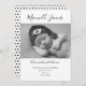 Um simples anúncio de nascimento preto e branco com o nome do seu bebê em caligrafia e bolinhas bonitas na parte de trás do cartão.