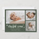 Cartão de anúncio de nascimento simples e retrorreflector com uma colagem fotográfica com um texto retroativo que diz "obrigado você" com estrelas à volta. A cor de fundo é verde-floresta.
