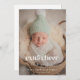 Cartões de natal com estilo retrô, de natal, com tipografia que diz "mais alegria este ano" com coração. Este é um cartão de anúncio de nascimento para as férias! Adicione suas fotos, estatísticas de natalidade e uma mensagem! A foto vertical funciona melhor na frente.