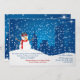 Envie saudações antecipadas de feriado e informe familiares e amigos sobre seu novo endereço com este cartão encantador. Ele apresenta um boneco de neve sorridente e uma paisagem urbana com muita neve caindo.